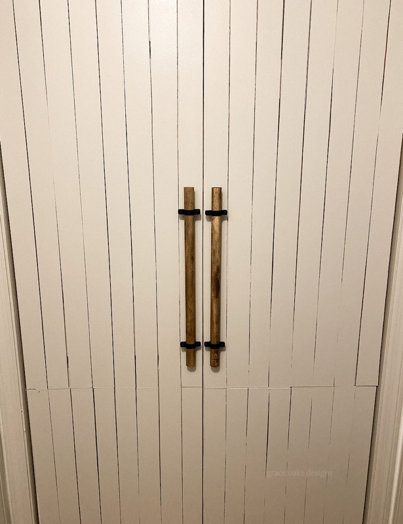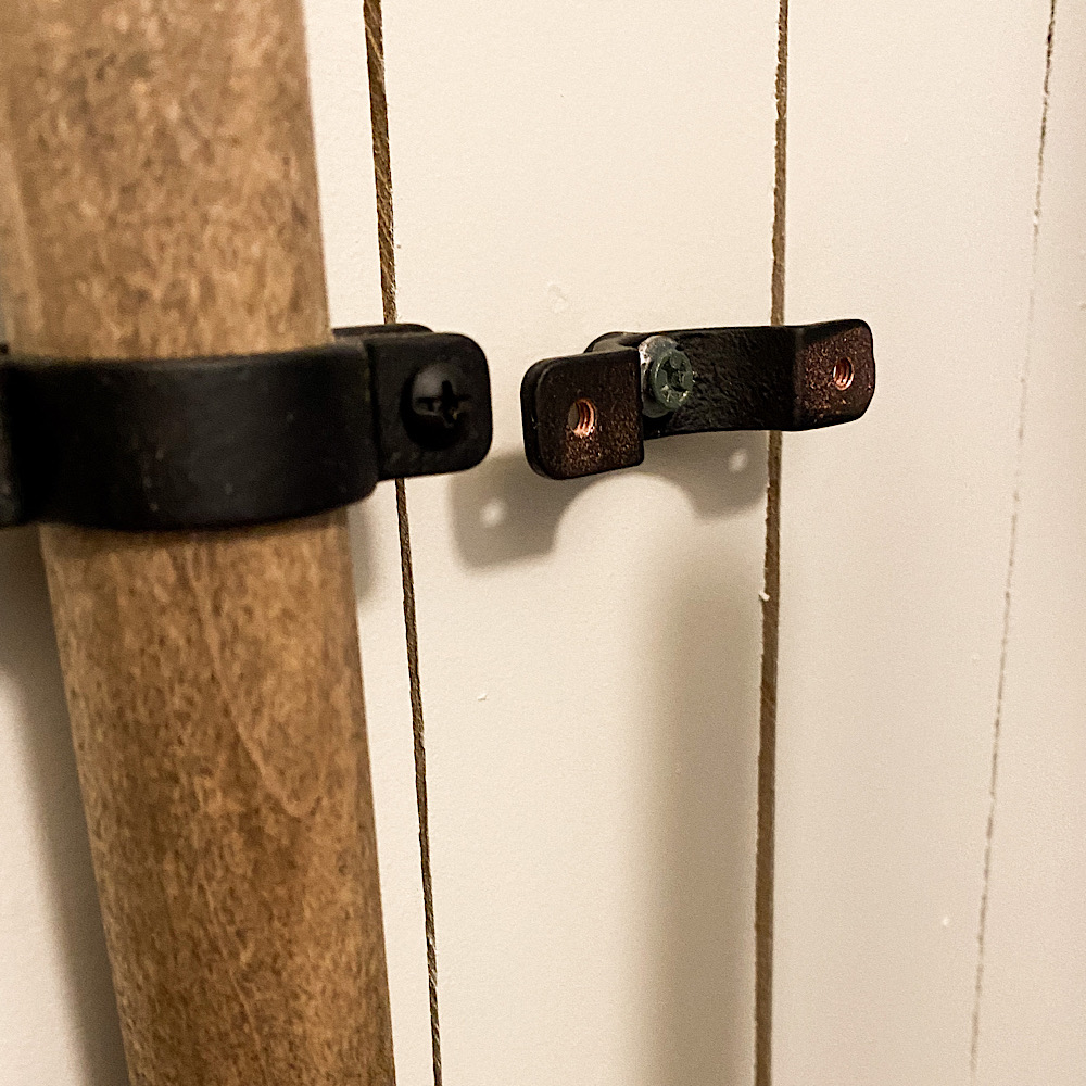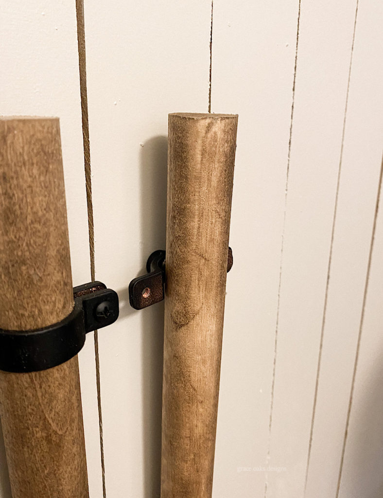 For the hardware I used 1 1/8” poplar dowel rods and 1” Copper Plated Split Ring Tubing Hangers to create big barn door handles. We had used these copper ring hangers before, and I like how it looked like metal hardware once spray painted matte black. Then, stained the dowels my favorite custom mix. I really think the bigger the better with these handles, you want them to make a statement just like barn door handles. We made ours 24” and could have gone a bit bigger too.