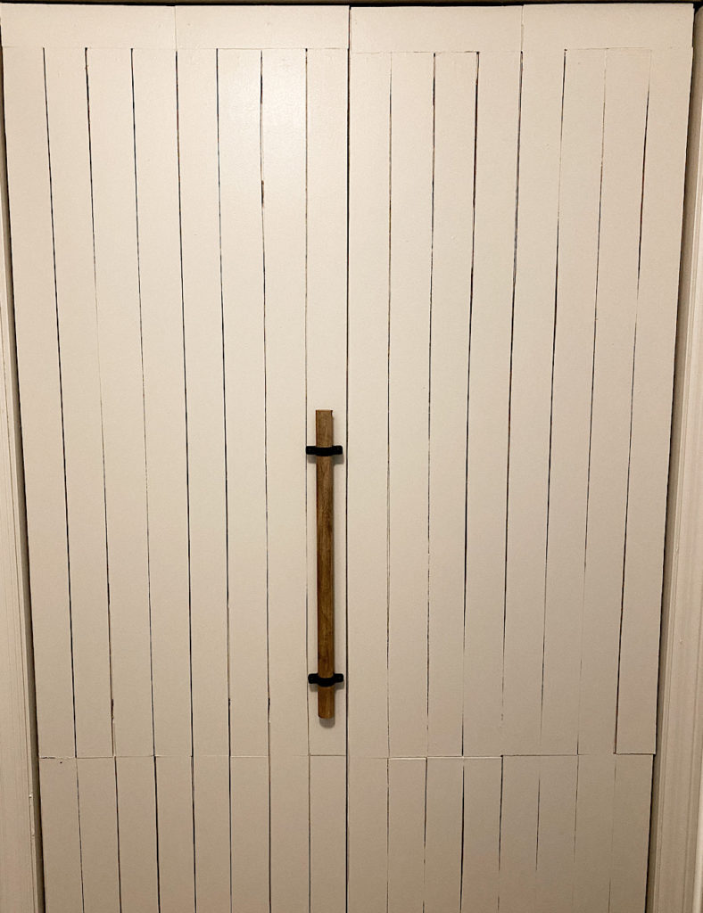 Once the boards were all up, I filled nail holes with wood filler and caulked the seams along the top, bottom, and where my boards met up along the center where I had a second row of boards meet. You could definitely create a design or run boards the entire length (I just didn’t have long enough boards using MDF). So many possibilities. I painted the doors and trim Benjamin Moore Revere Pewter.