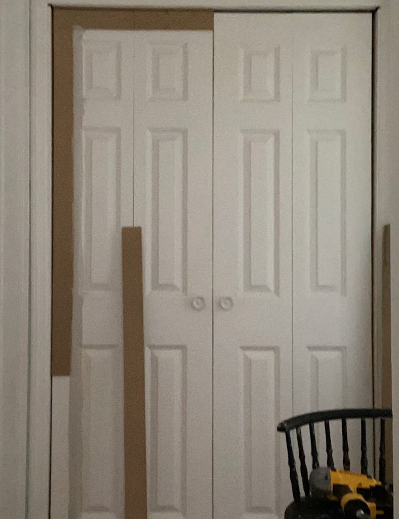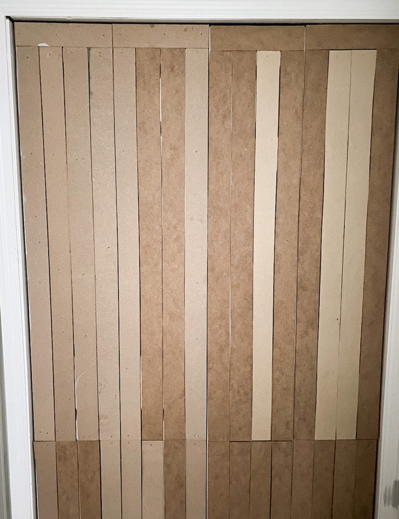 It would go even faster had I taken the doors off, but I wanted to be sure I wouldn’t hit any of the track and be able to open/close freely. It really was so simple and pretty quick. Be careful to watch the sides – do not make boards flush with the sides needs to be about 1/8” gap so the door can fold itself without the wood hindering it. Also, along the top, bottom and middle watch for natural gaps in the bifold doors – do not cover those as it’s needed to freely open/close.