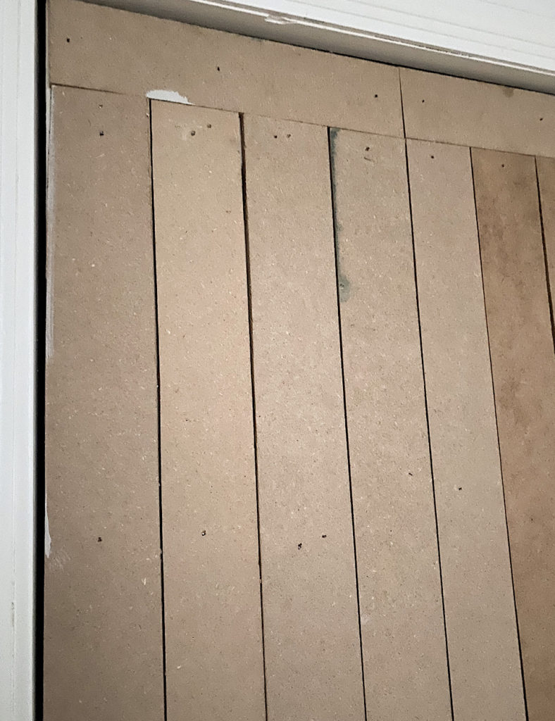 I used ¼” MDF because it was leftover material I had, but thin ¼” plywood would work better as it’s even lighter material. I simply nailed up pieces along the top and bottom to create an edge or border. Then, filled in the centers nailing up boards vertically to look like shiplap.