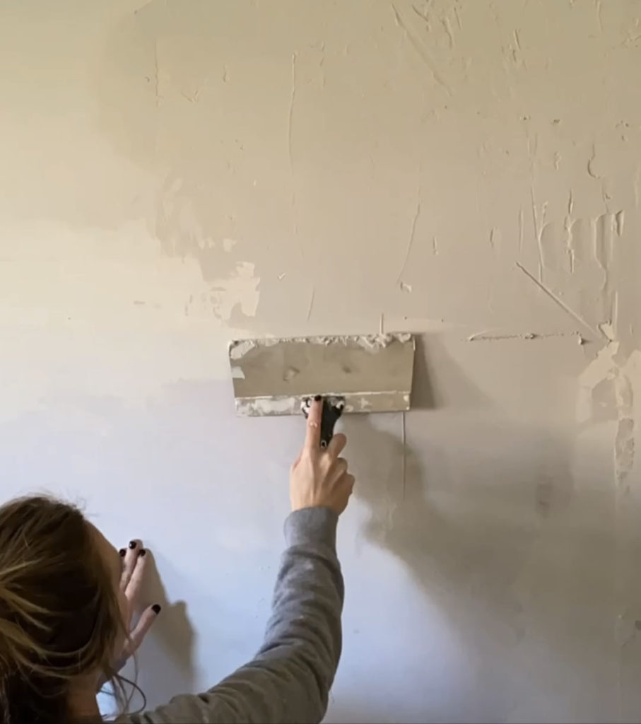 Finally, it was time for concrete! We used white Ardex Feather Finish – 2:1 ratio of Ardex to water. Have to work really quickly as it dries in about 15 minutes. My husband continued to stir our bucket of feather finish while I used the spackle knife to apply it directly on the drywall. I used up and down and side to side motions just as you would spackling a wall or doing the german schmear technique.