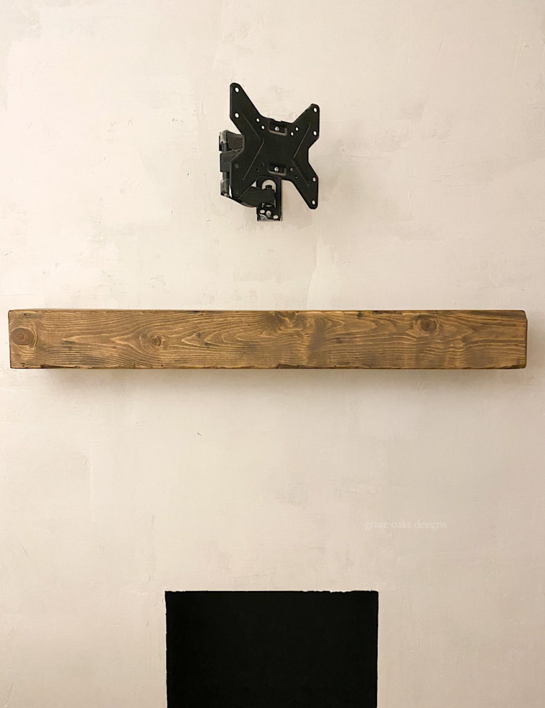 To wrap up this project we knew we needed to add a new mantel since this fireplace is completely different than what we had before. I wanted a big beam looking mantel just as we had before but not as substantial or wide. To make it we used 1×6 pine and nailed 3 sides together. Leaving one long side open to slide over top of the 2×4 bracket. I distressed the mantel once it was put together using my aging wood technique (check IG story highlights to see this in action). I use nails/screws/chain-link with a hammer and hammer it into the wood on all sides. Then, using the hand saw, jigsaw, and wire brush drill attachment to distress the wood. I stained using my custom mix stain but added Rust-oleum Flagstone. It’s a little darker than I wanted but in the same stain color family. I really like the warmth!