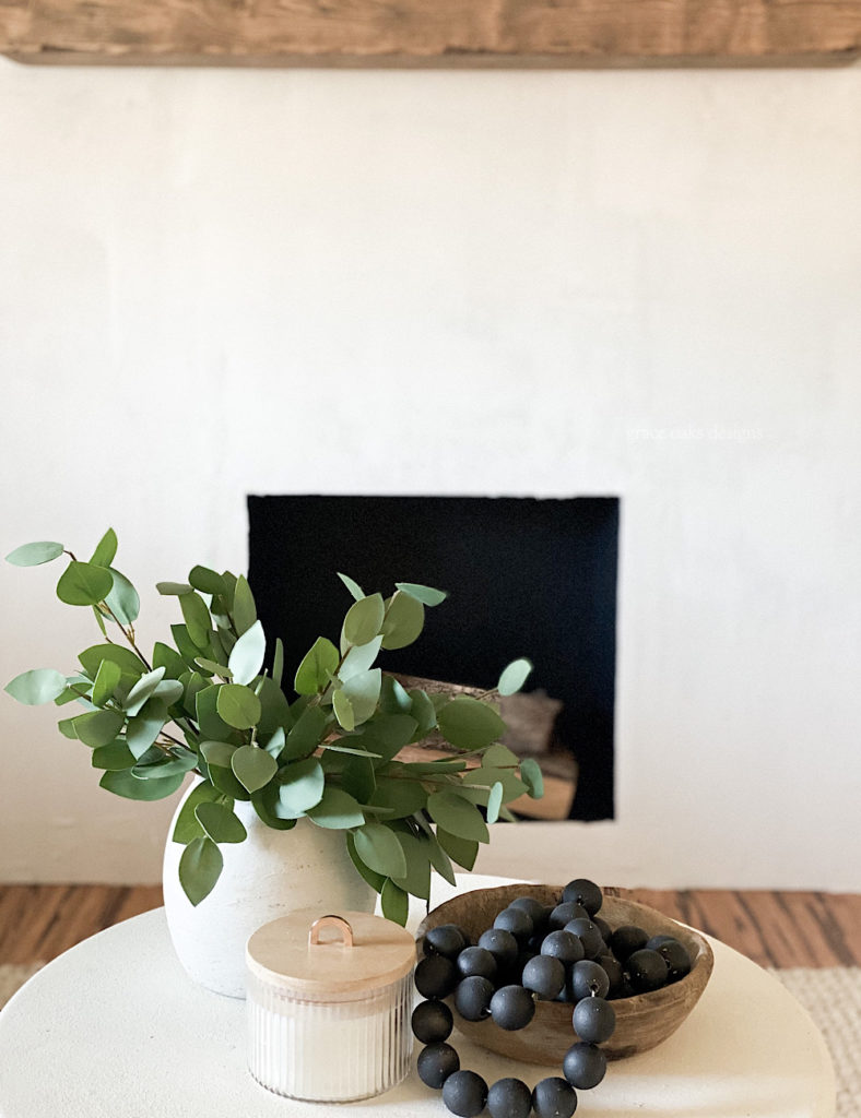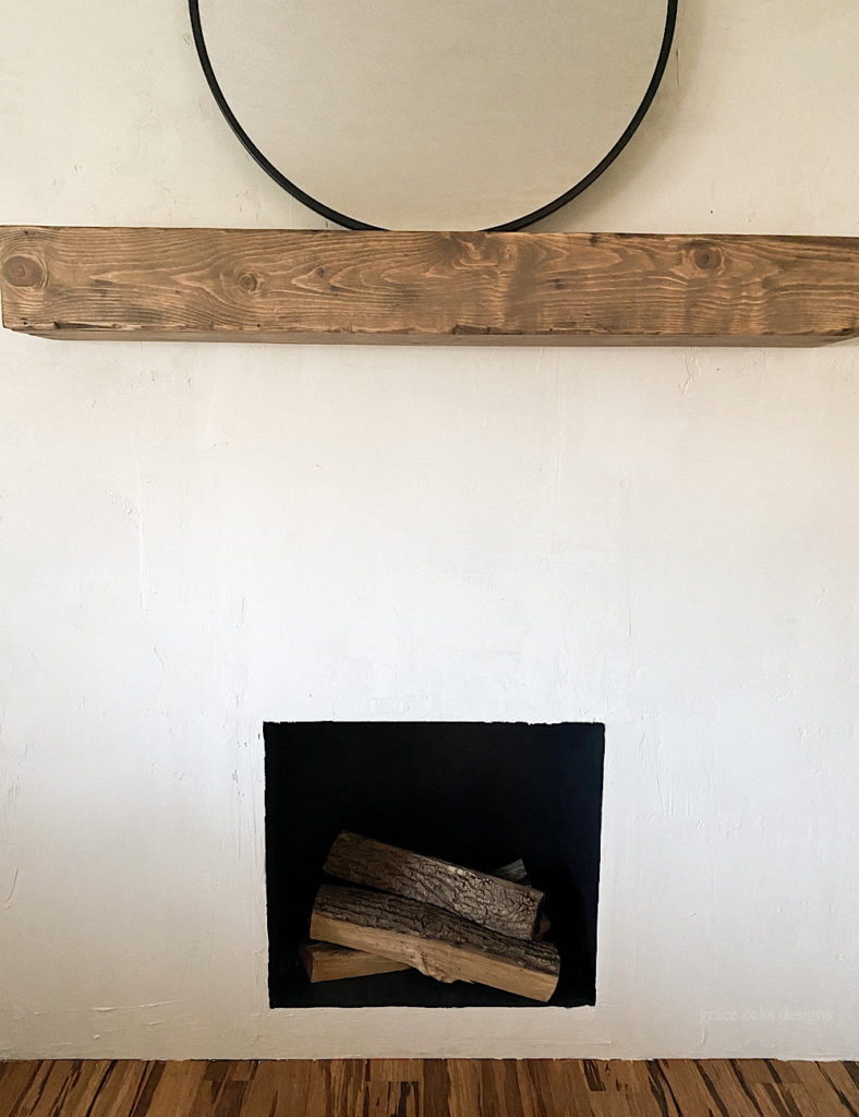 I designed this fireplace to fit an electric insert should I choose to add it down the road. Right now, I really like the look with just the wood logs. After winter I’ll use birch logs to soften the look. We kept the insert top partially open (you can’t even see it unless your head is inside) to access tv cords and to plug in the insert if we add it later. I painted the inside Sherwin Williams Tricorn Black, my favorite black!