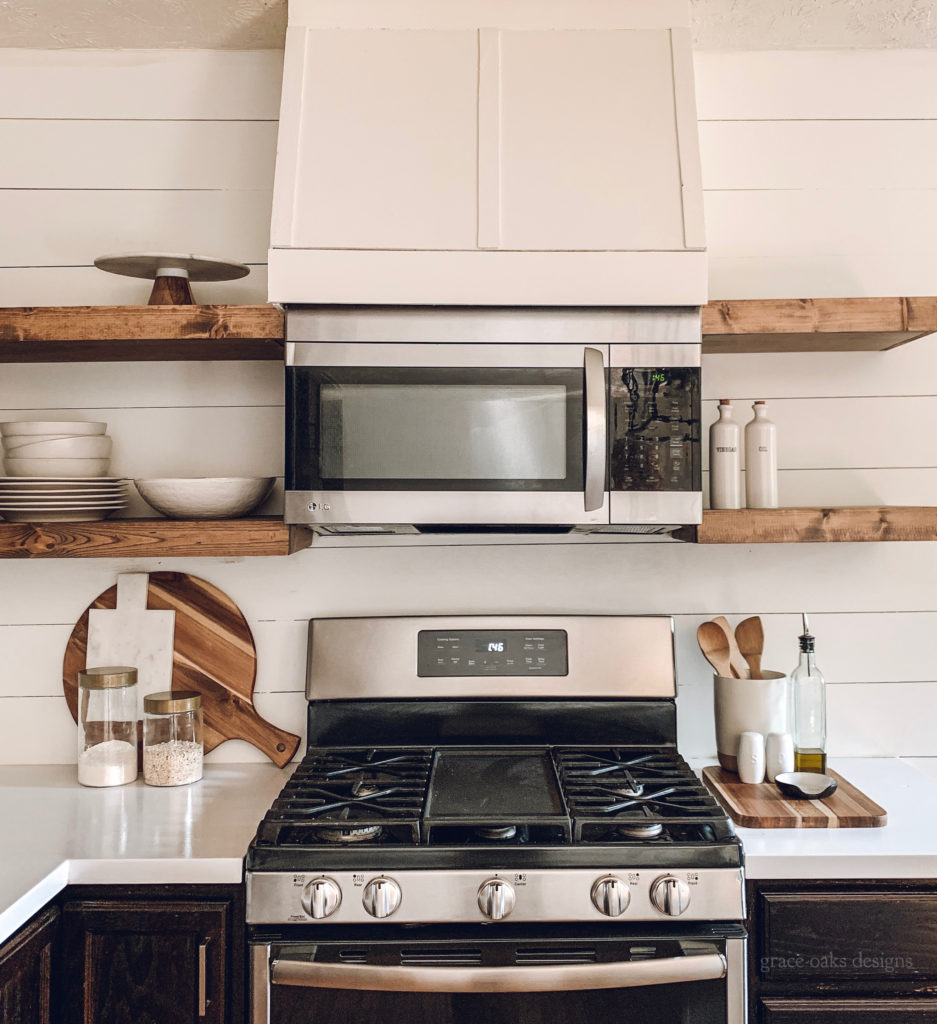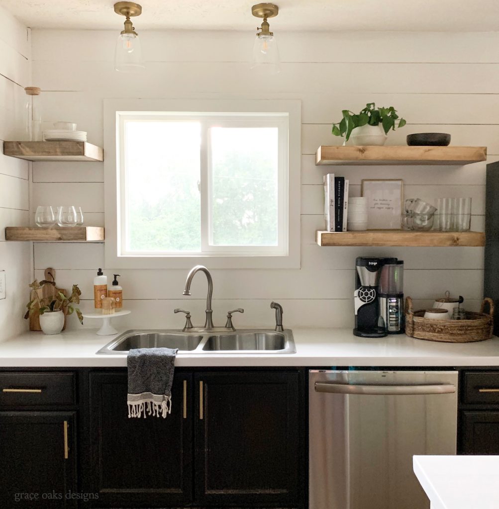 If you’re anything like me you love open shelving and creating all the #shelfies. Custom open shelving is such a large investment so in our kitchen refresh we decided to make our own floating shelves as thin as possible to look nice, sleek, and clean.