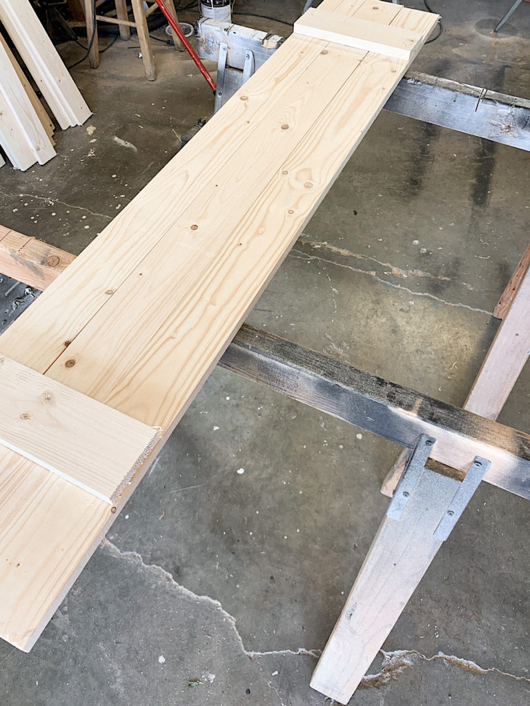Then, cut another 1×4 to the length of the two or three boards running across the width. We used a nickel to space the boards in-between each other for a bit of spacing as we nailed the cross board on using 1 ¼” nails.