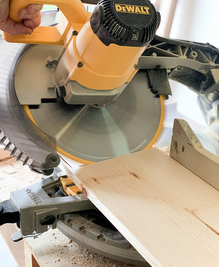 To start, we measured the length of our windows and cut 6 1×4 boards to that size length. Alternately, you could make them less wide like we have now and only cut 4 total boards, two for each side of the window.