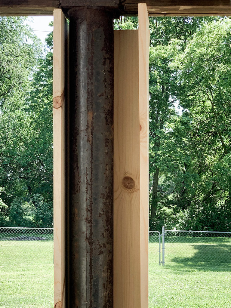 On the patio we completely tore those basic wrapped columns down and reworked them. Added a 2×4 running on the front and back of the column to stabilize the new wood we’ll be wrapping around it.