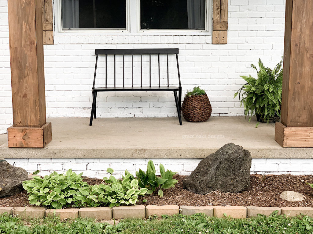I sanded them down and stained the same as the columns. Ours aren’t hung just yet but we’ll use a concrete drill bit and screws to drill through the brick. I plan to use a little black paint to touch up the screws and they’ll hide well into the dark stain.