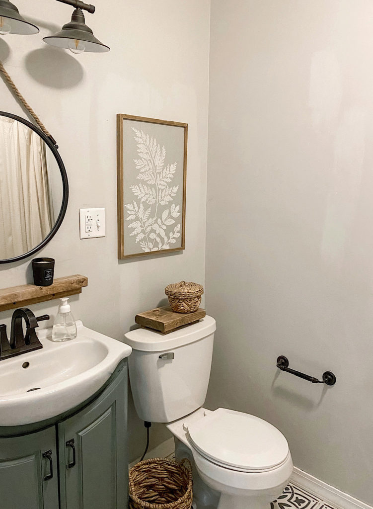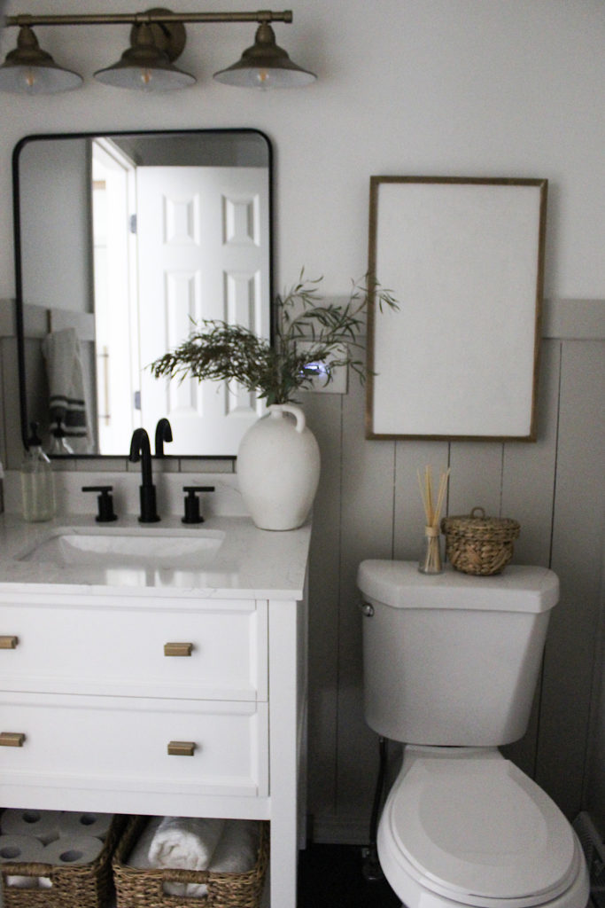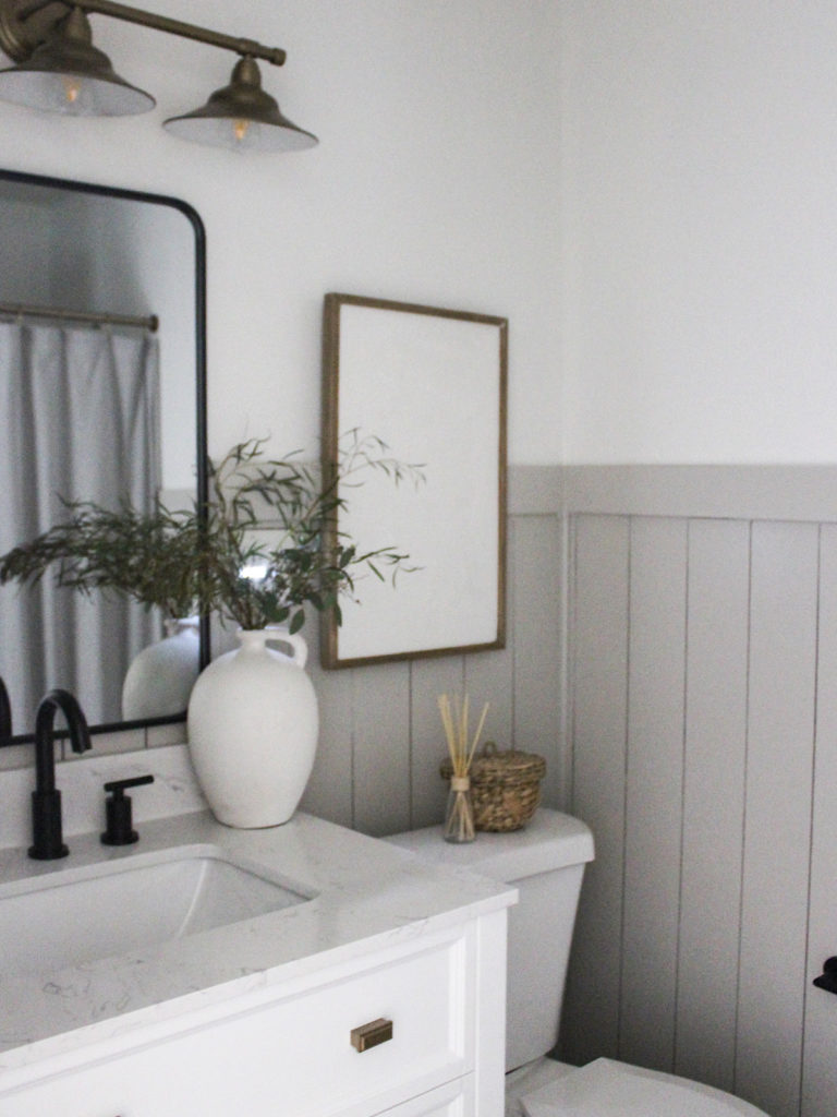 Using affordable hardware and finishes that have a designer look can elevate a space without breaking the bank. My mirror, faucet, lighting, and hardware are all very affordable options. A beautiful curated look by mixing metals and bringing in unique, personal decor details make all the difference in finishing any space.