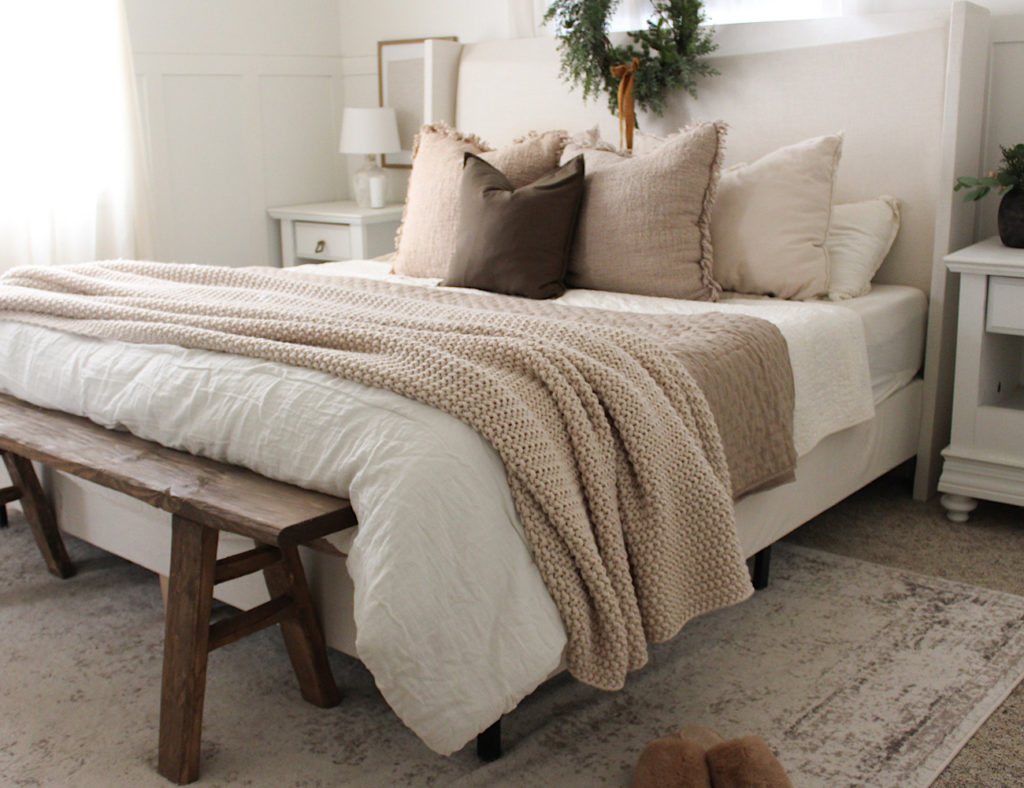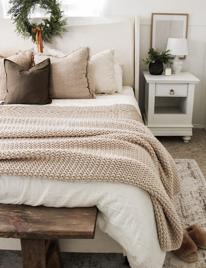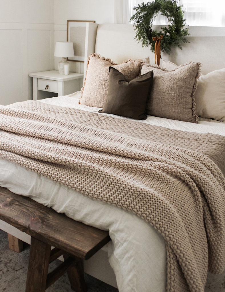 I also opt to switch our linens for the holidays and winter season. I keep our same linen sheets and comforter, my absolute favorite! I add an extra quilt in a warm tone like this beautiful taupe and a knit blanket. Fur, knit, and cozy sherpas are great textures to add for the season.
