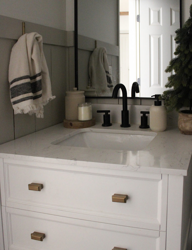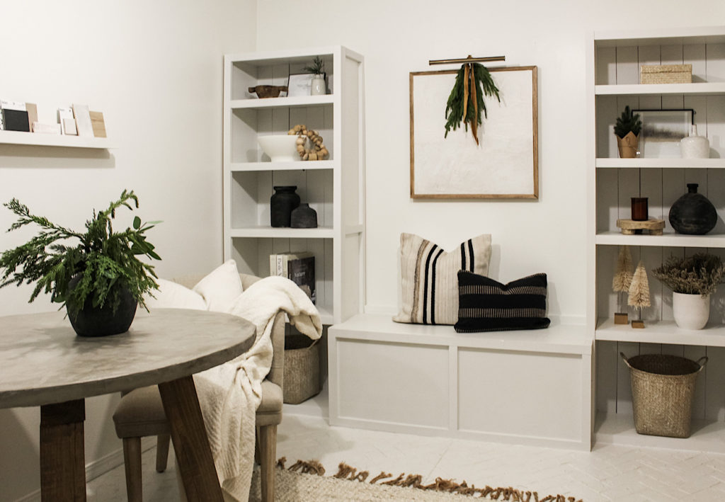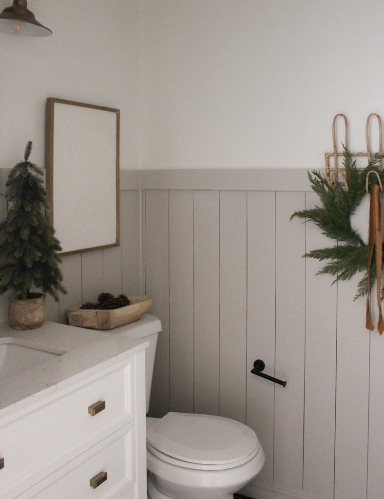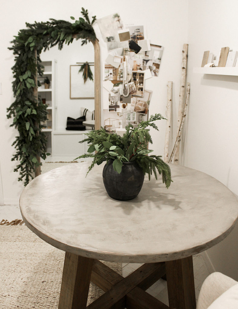 Finally, into my home office I set the tone for a festive holiday workshop. I spend a lot of my afternoons during the week in here, so I wanted to bring in a little cheer. A swag over the picture light is one of my favorite minimal accents to add to any space. Also, a big, fluffy, full garland draped over the mirror looks so good!