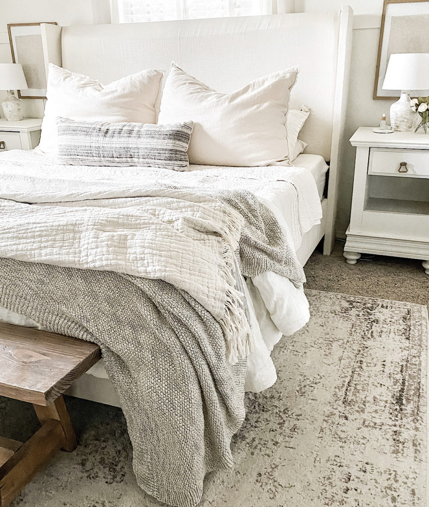 -Softness: when choosing linens, I almost always choose light tones. I prefer a light and airy space that feels calm and serene. I want our bedrooms to feel like a warm hug. Soft, calming, an oasis. Adding lamps, pretty textures, linen curtains, woven details- they all add to the sense of the feelings I’m trying to create.