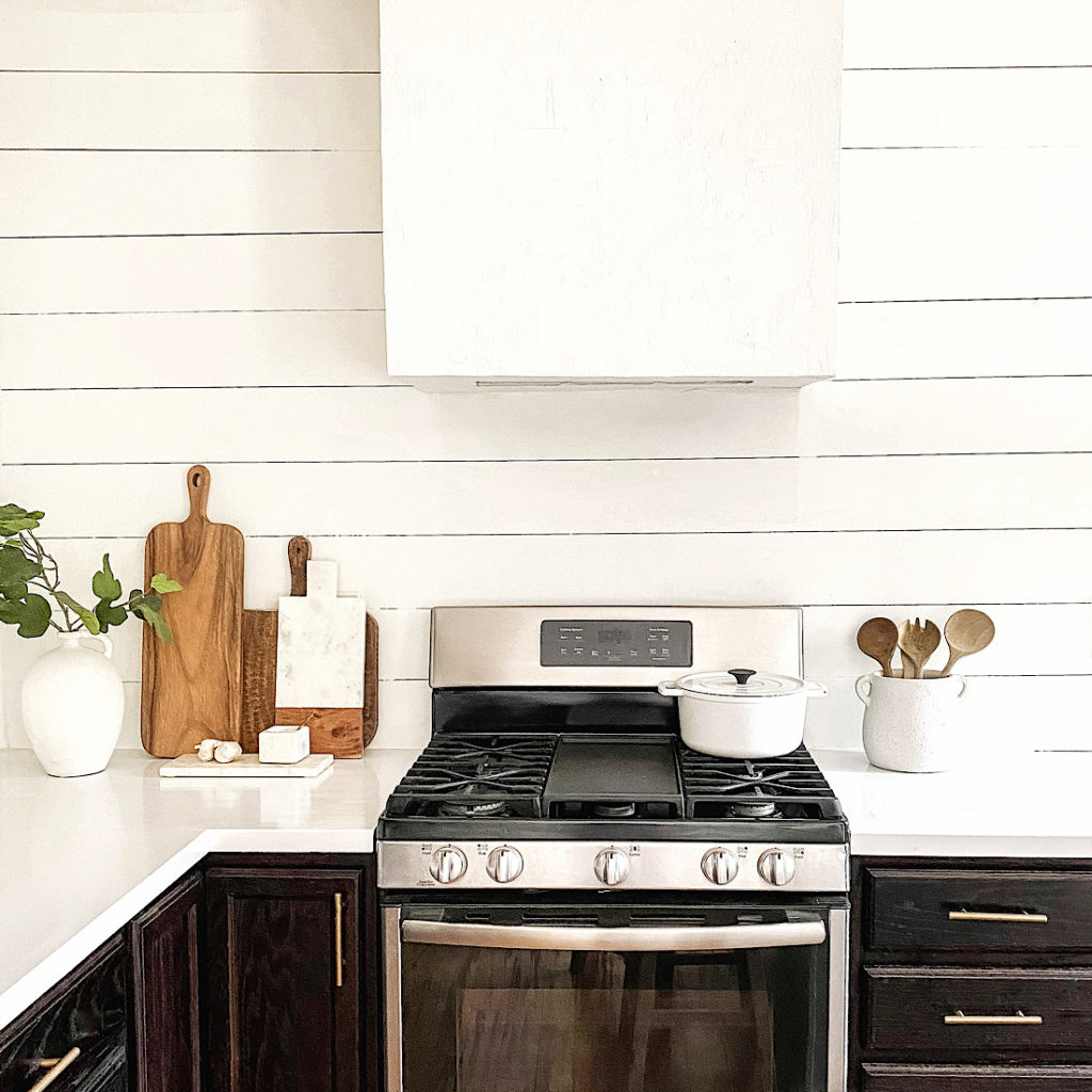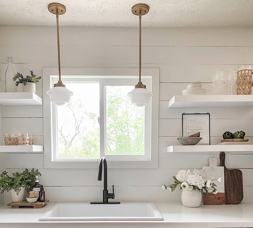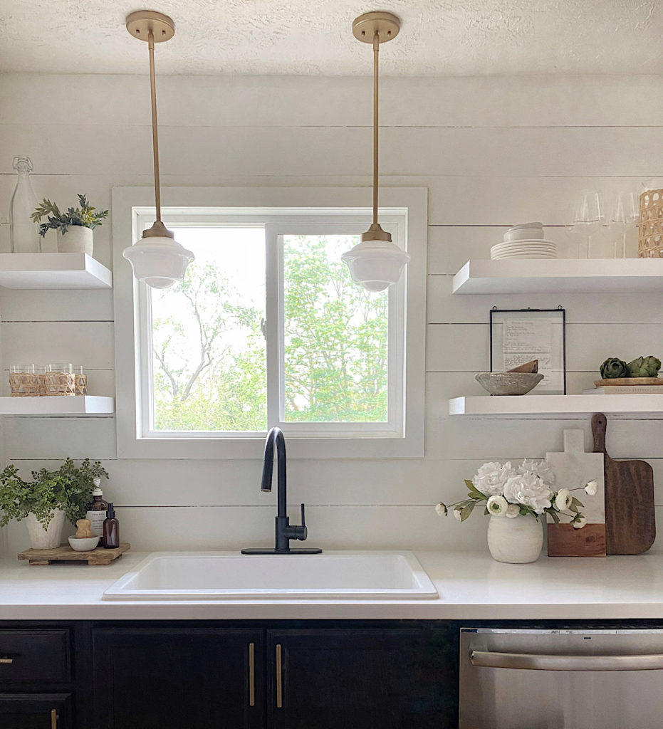 Before we had chunkier wood floating shelves, we replaced our upper cabinets with, but I’ve been wanting a sleeker and more modern look. Our new floating shelves are from Ultra Shelf in white. They have white oak, maple, stained and painted options. You fully customize your size, color and type of shelf, and it includes the hidden bracket! The metal bracket has several hole options so you’re sure to install into the studs, and it’s designed for the shelf to slide right overtop, conveniently hiding the hardware. I can’t recommend them enough, I’m incredibly happy with the style, quality, and the affordability! We have the painted white in 2″ thick, 12″ depth.