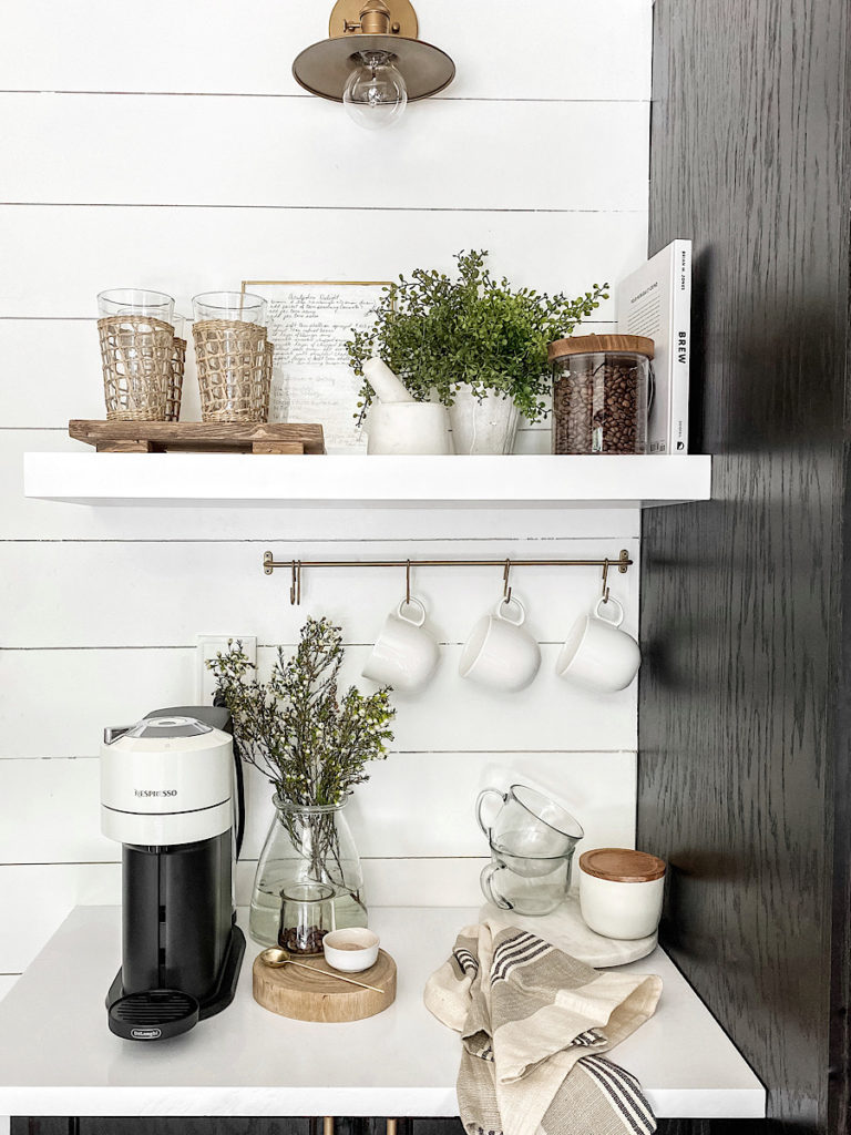 The last piece to this mini refresh was adding a coffee bar. We have this smaller unused wall next to our pantry cabinet and it’s always felt unfinished. I got the idea to bring in some added counter space and storage by repurposing a set of our upper cabinets as lowers on this wall. We used a nice smooth piece of poplar board painted in the white epoxy like our countertops for a quartz look see more on that HERE.