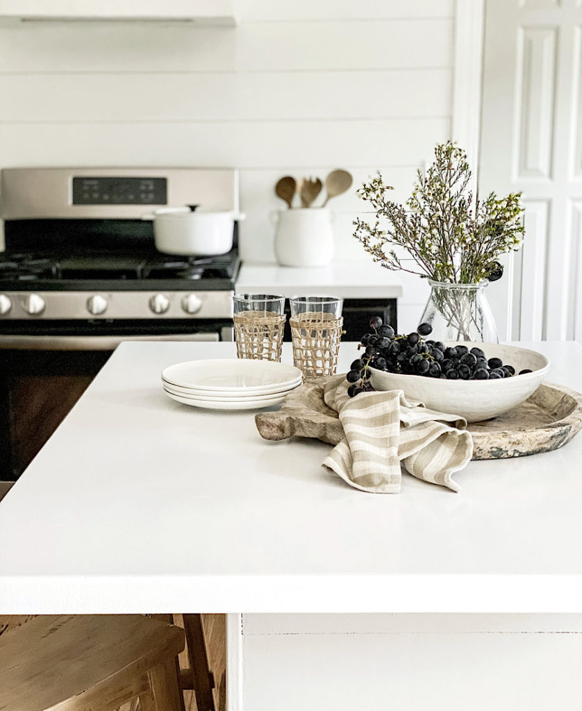 Our kitchen is the perfect example as it’s taken on a few refreshes over time, the foundation has remained the same: cabinets, counters, and flooring. We removed upper cabinets to install floating shelving, swapped light fixtures, hardware, counter stools, and decor. We recently added a few pieces to our kitchen to gravitate closer to my desired organic vibe.