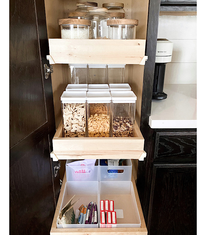 When it comes to food storage, I prefer to see what we have. It takes less time for meal planning and making shopping lists. I enjoy having it look nice and neat while still being pretty in my pantry cabinet, and also easier for the kids to see their snacks!