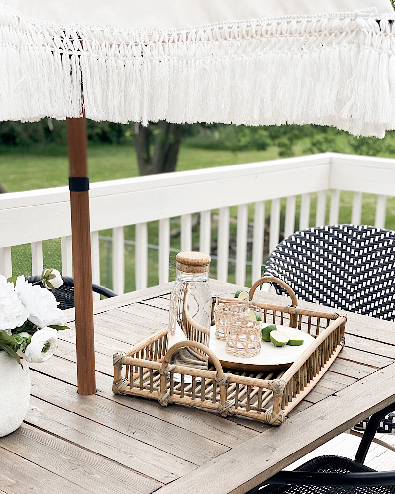 Next, I knew there were a few areas of concern with the patio I wanted to refresh from last season. I love a good white and black contrast, but our patio felt very dark with all the dark accents and our sage green siding. One thing I love about our front exterior is it’s all white brick so the black really pops. However, doing that on the back of our home doesn’t offer the same punch with the siding.