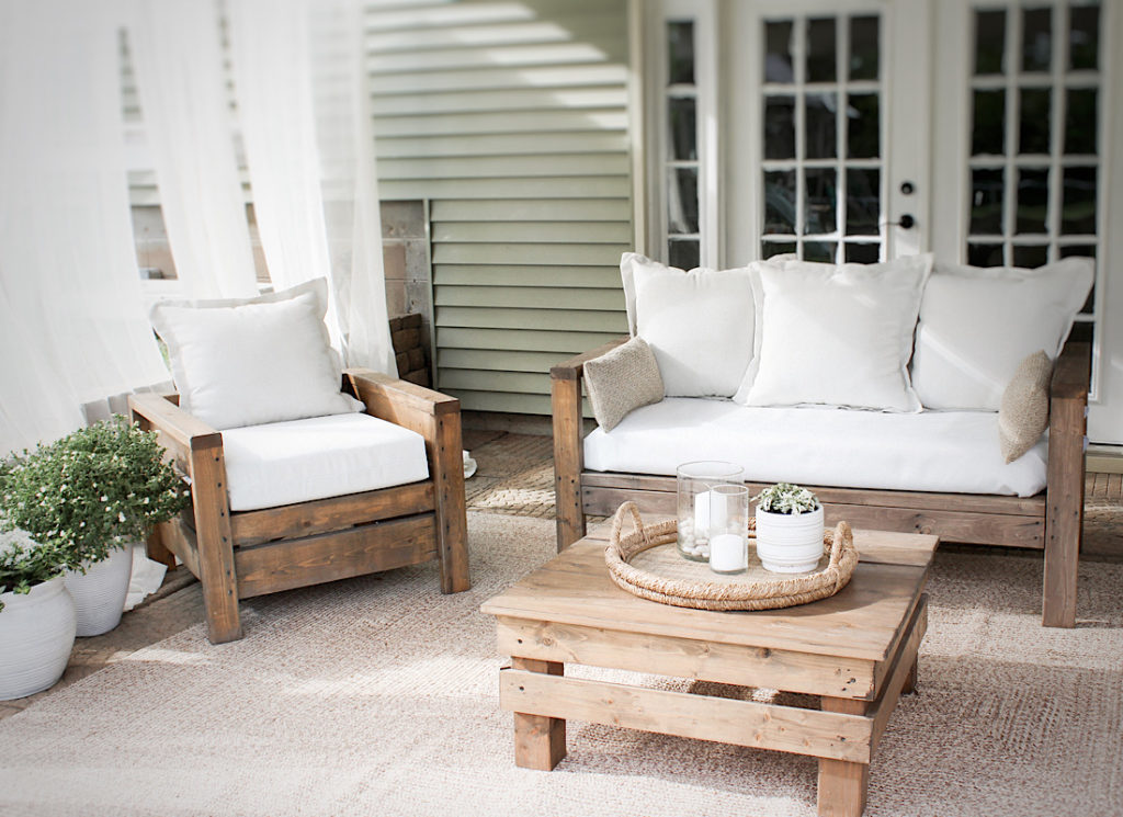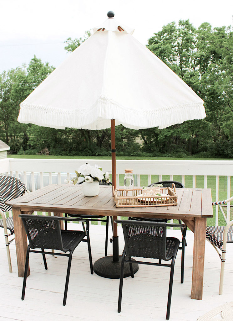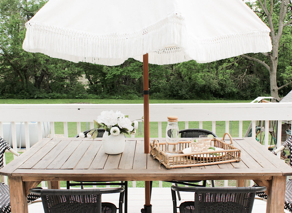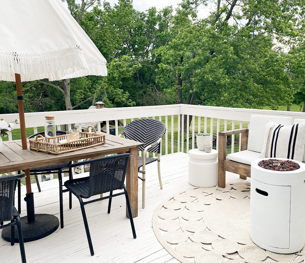 To start, we gave our deck a fresh coat of our favorite stain, we use Sherwin Williams Super Deck Solid in color Realist Beige. It’s a solid coat stain that mimics the look of paint but it’s stain. It held up really well from our harsh winter minus a few scuffs (mostly the walkway from our dog).